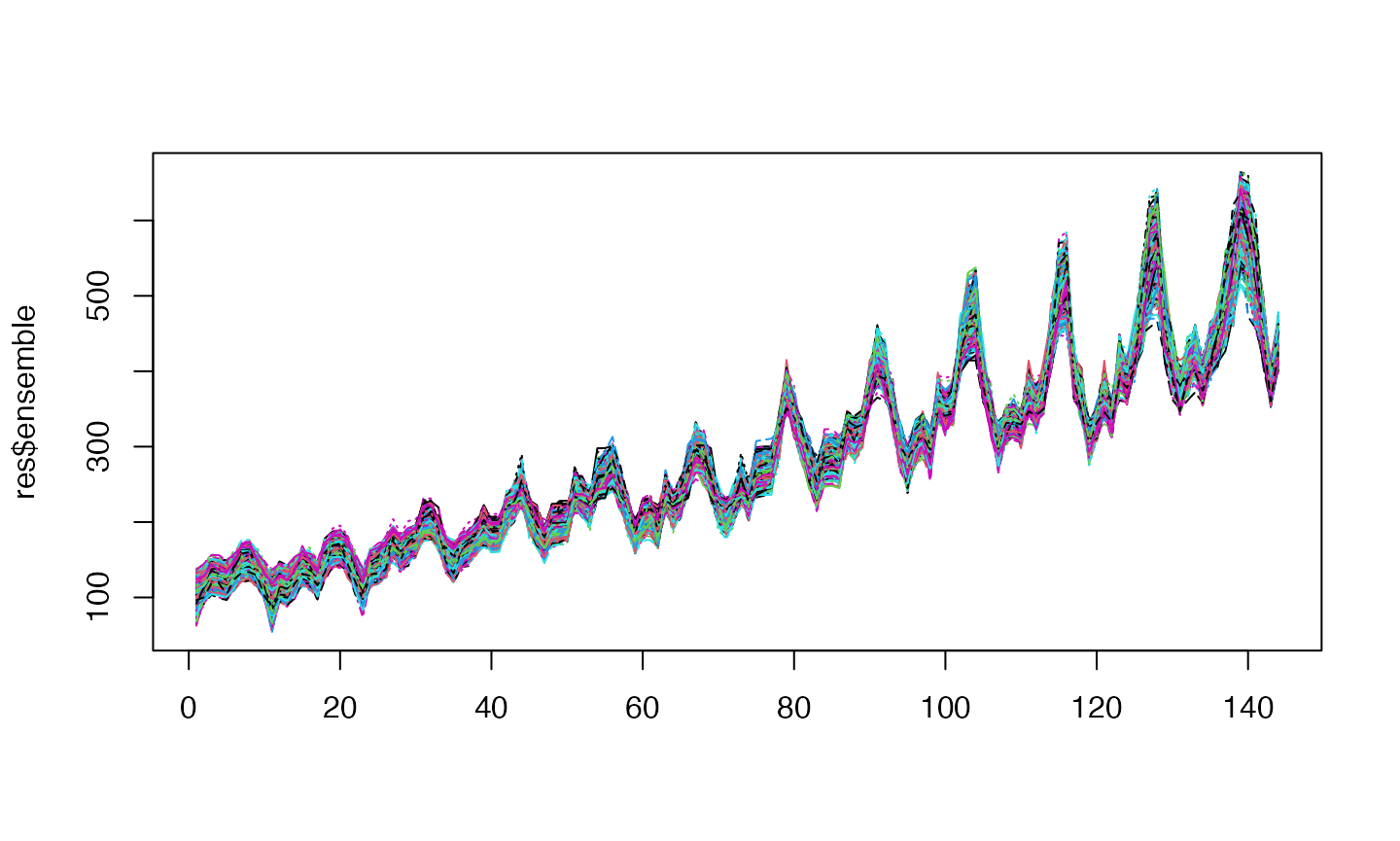 res <- meboot(AirPassengers) matplot(res$ensemble, type='l')